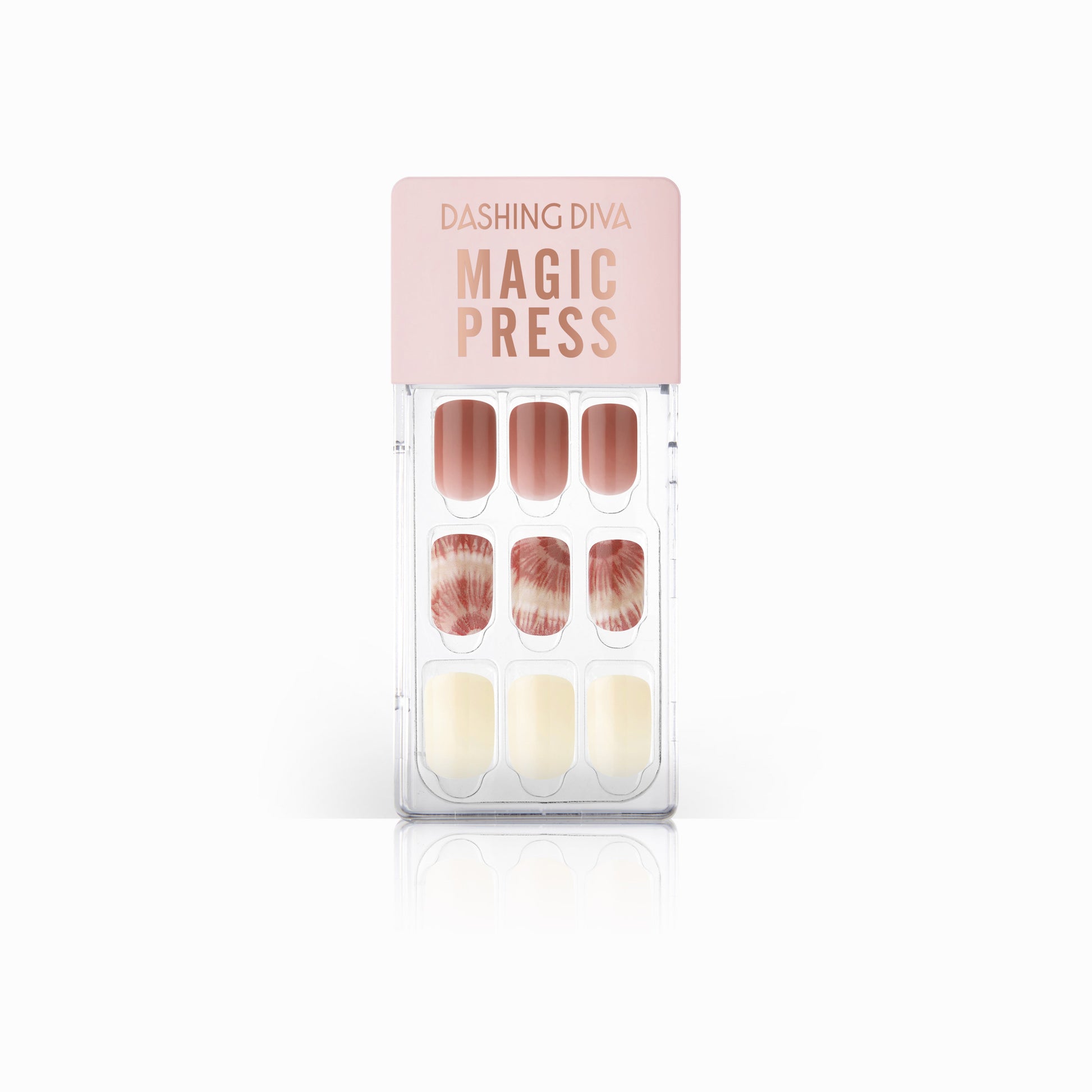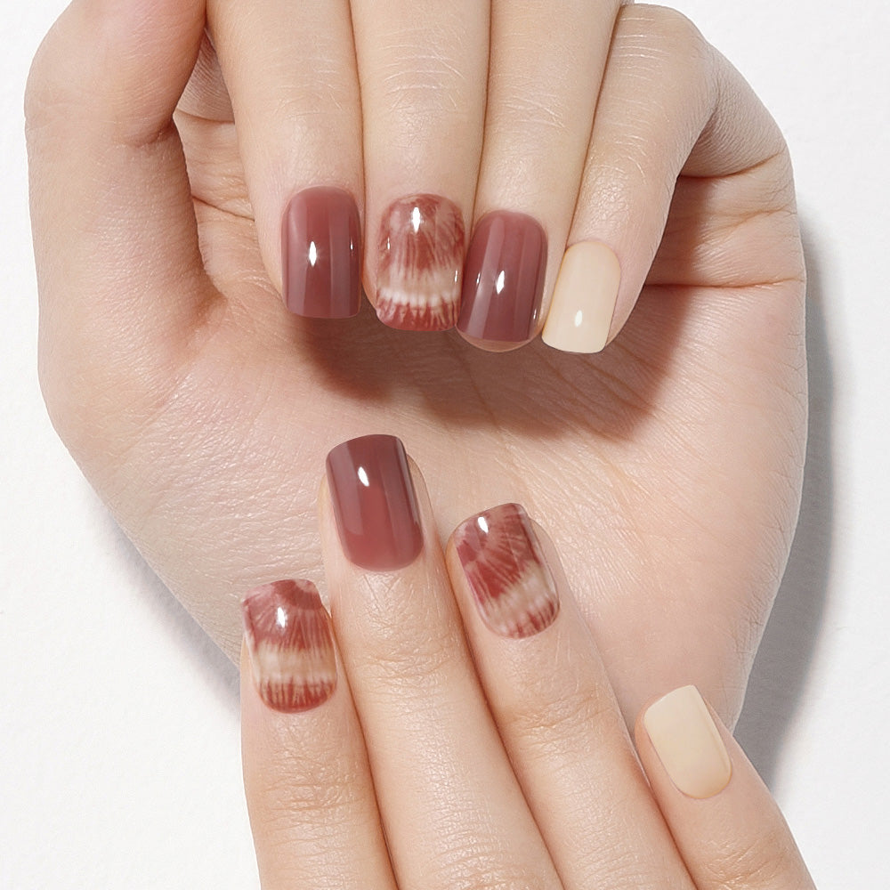 Nail design that adds uniqueness by applying a hatching dyeing technique to nails and reminds of an elegant maxi dress with a sheer cream color and brown color.