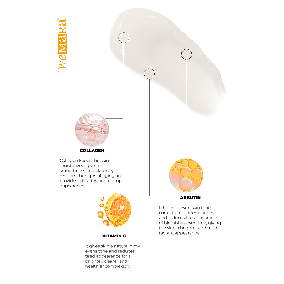 Description: Mara Brightening Face Cream deeply hydrates your skin with its rich collagen content, refreshing it and supporting a firmer, plumper appearance. With arbutin, it helps to even out your skin tone, while vitamin C supports a brighter and more radiant complexion. The rich seaweed and centella extracts help improve skin elasticity. The special packaging with a massage applicator allows the intensive active ingredients to deeply penetrate your skin. The specially designed massage head also helps prevent the appearance of wrinkles.