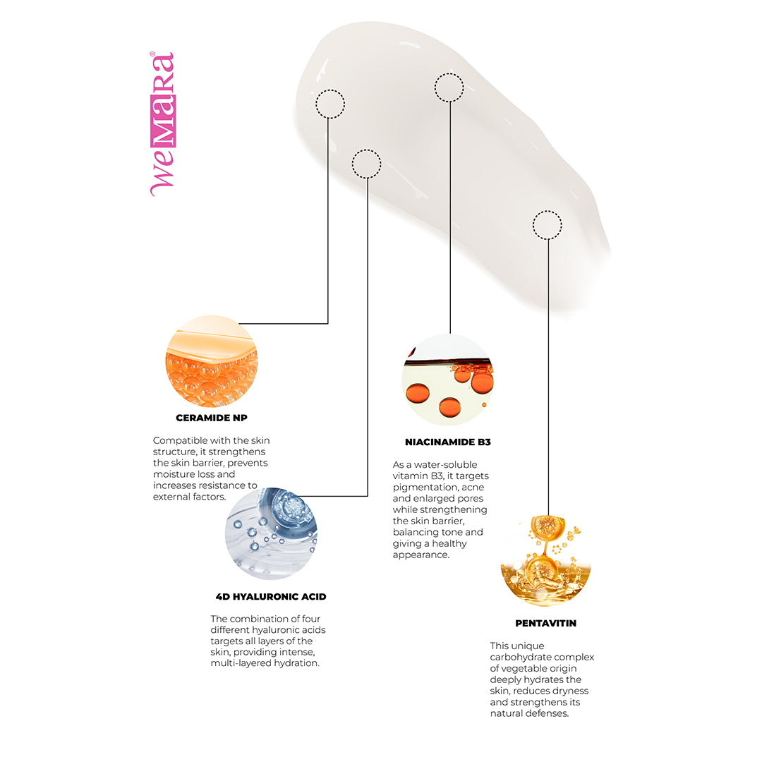 How to use: Before applying the moisturizing cream, cleanse and dry your skin. Apply a small amount of the product to your face and neck using the massage applicator with circular motions. Do not rinse. Suitable for daily use.